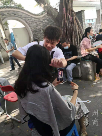 由于师生们优质的造型设计能力,即便天气炎热,街坊们的热情不减,耐心排队等候,这里还包括周边学校的初中生们也被吸引过来,接受志愿者们的服务。